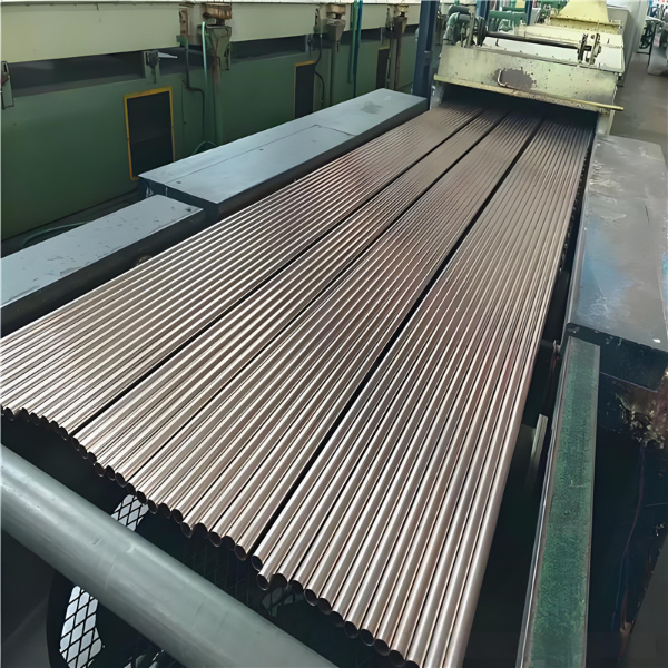熔炼 → 扁锭浇铸 → 热轧成板材 → 板材纵剪(定宽)→ 冷弯成型(圆管)→ TIG 自动焊接(无填料,焊缝光滑)→ 焊后固溶处理(650-700℃,消除焊接应力)→ 冷拔校直 → 切管 → 酸洗钝化 → 超声波检测 / 气密性试验 → 包装入库